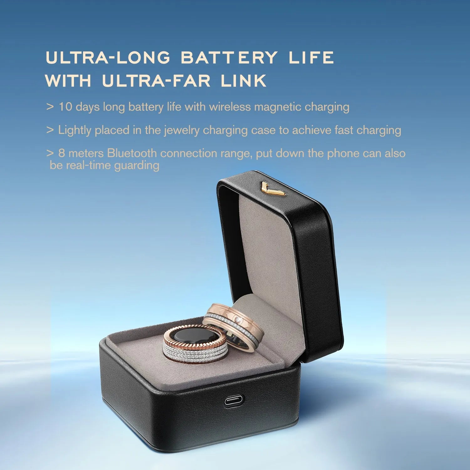 - LONG BATTERY LIFE - 10 days of long battery life with wireless magnetic charging, light placed in a jewellery box shaped charging case to achieve fast charging. 8 metres of ultra-long range Bluetooth connection, put down the phone can also be real-time guarding.